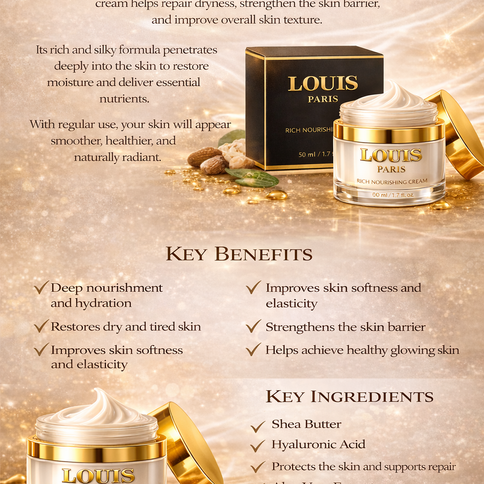 Louis Paris Rich Nourishing Cream is a luxurious formula designed to deeply nourish, restore moisture, and improve skin softness while protecting the skin barrier.